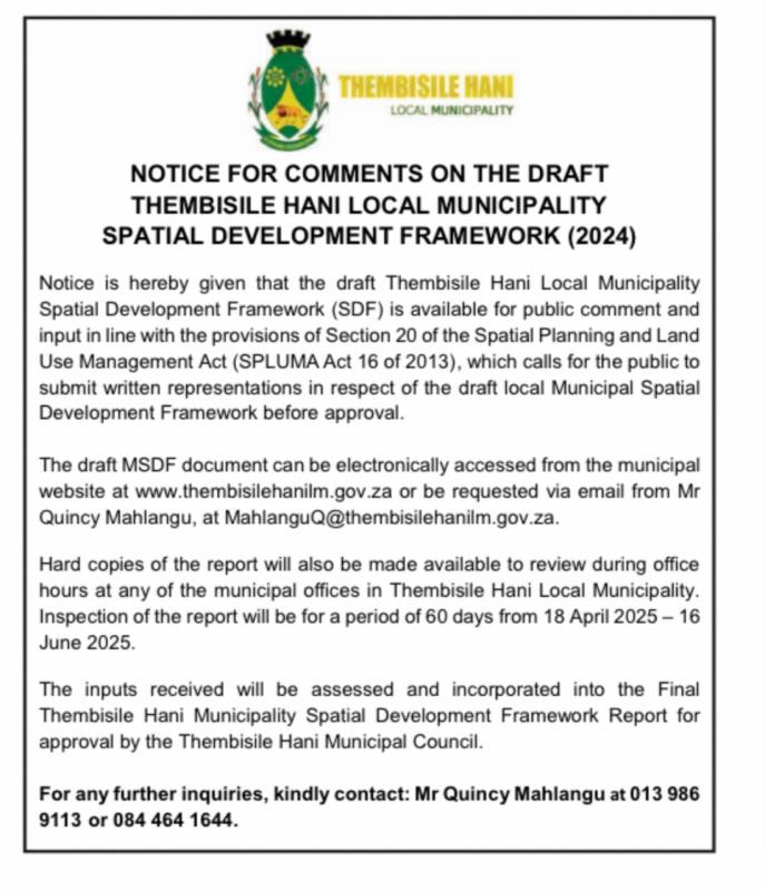 Notice For Comments on The Draft Thembisile Hani Local Municipality Spatial Development Framework (2024) Date of Publication: Fri, 04/18/2025Documents: Annexure A_ Thembisile Hani Local Municipality Draft Spatial Development Framework 2025 31 01 2025_compressed.pdfDocument Category: ReportsSection: Documents