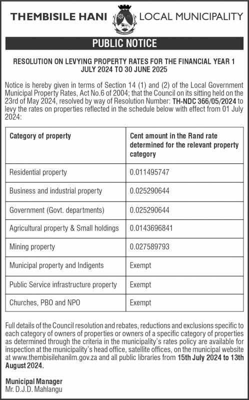 Public Notice 22 July 2024: Resolution On Levying Property Rates For F1 1July 2024 - 30 June 2025 Date of Publication: Mon, 07/22/2024Document Category: ReportsSection: Documents
